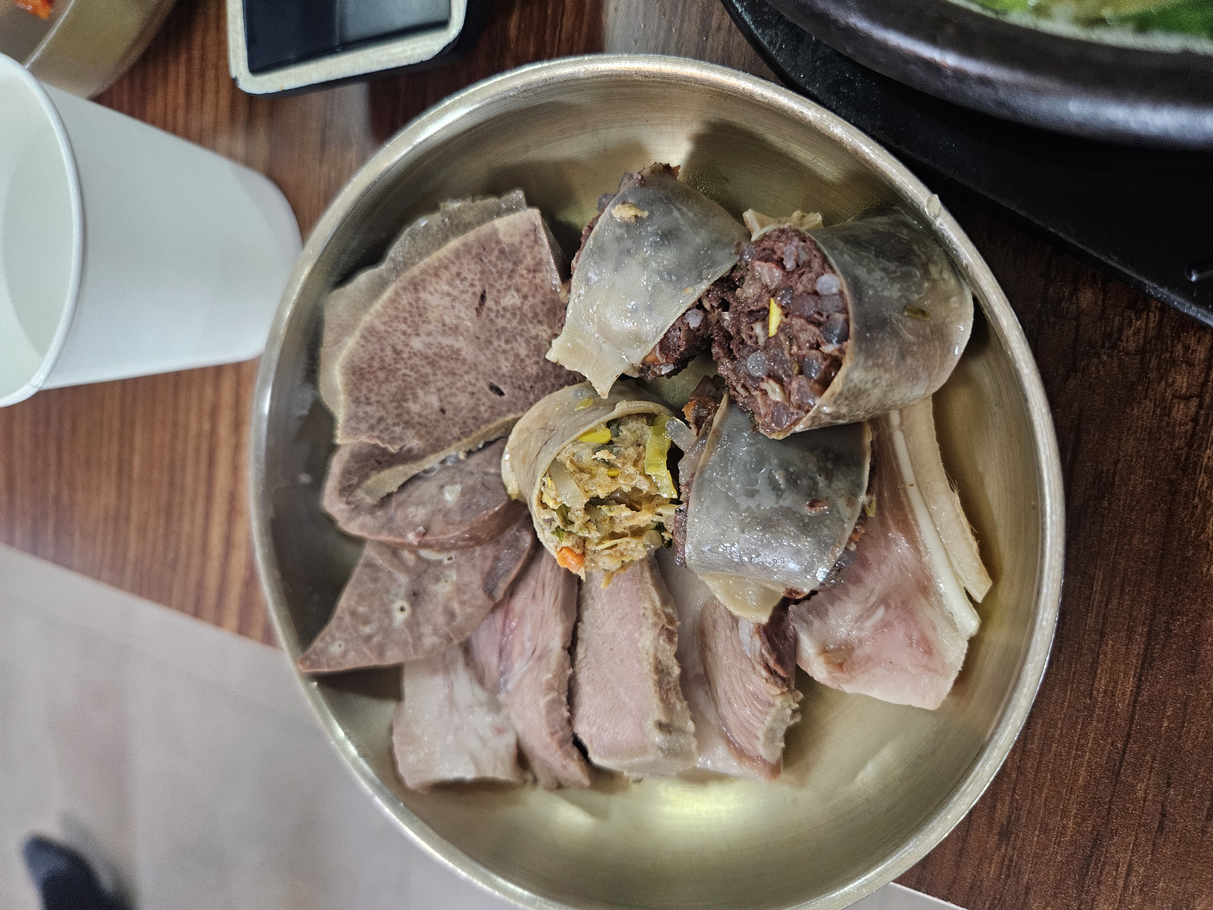정식을 시키면 뜨끈한 순대국은 기본이고, 옆에 수육, 찰순대, 야채순대, 그리고 내장 부위가 가지런히 담긴 접시가 따로 나옵니다. 13,000원이라는 가격이 믿기지 않을 정도로 고기 양이 상당해요. 잡내는 1도 없고, 고기는 야들야들해서 입안에서 녹아내립니다.