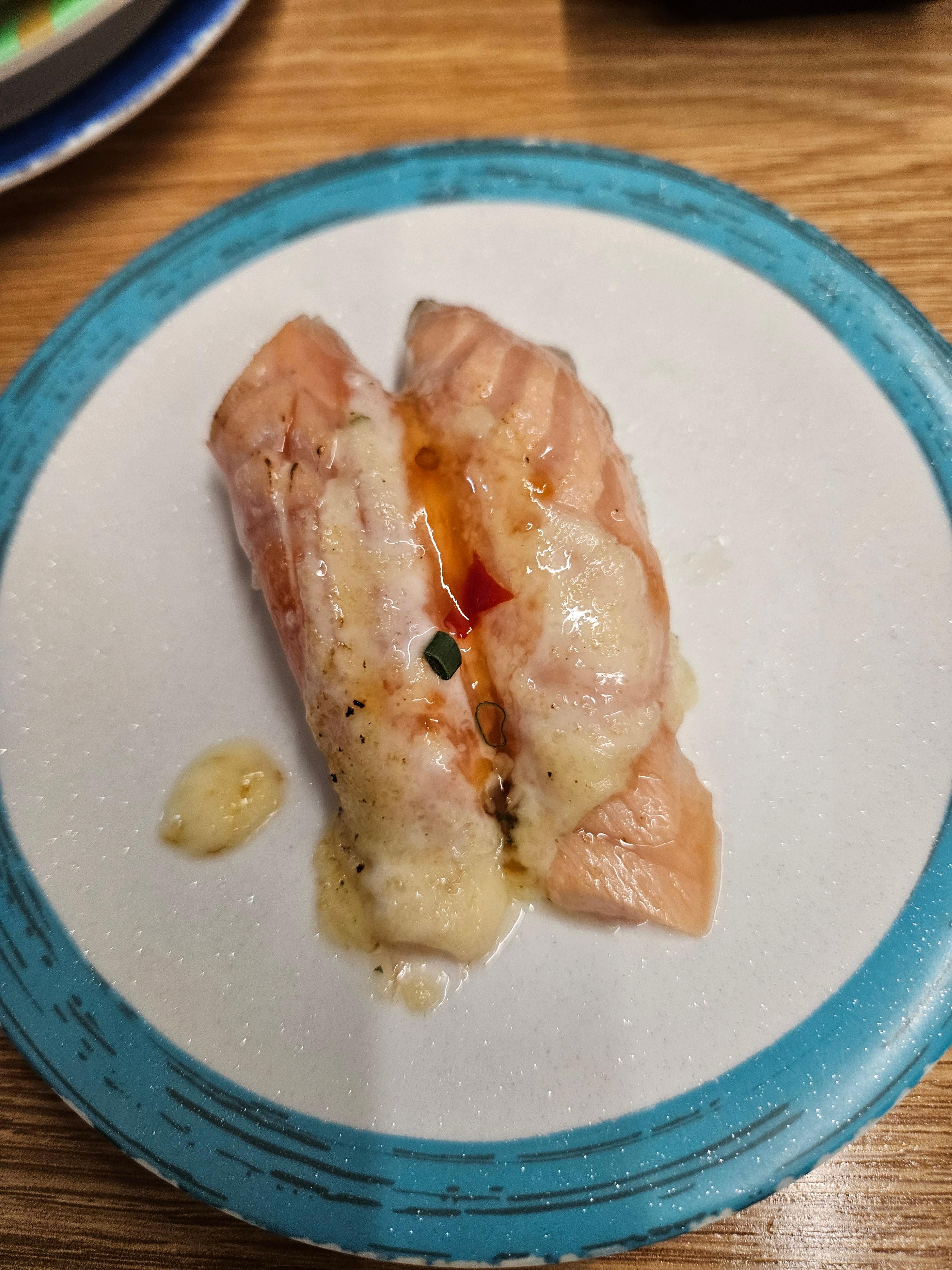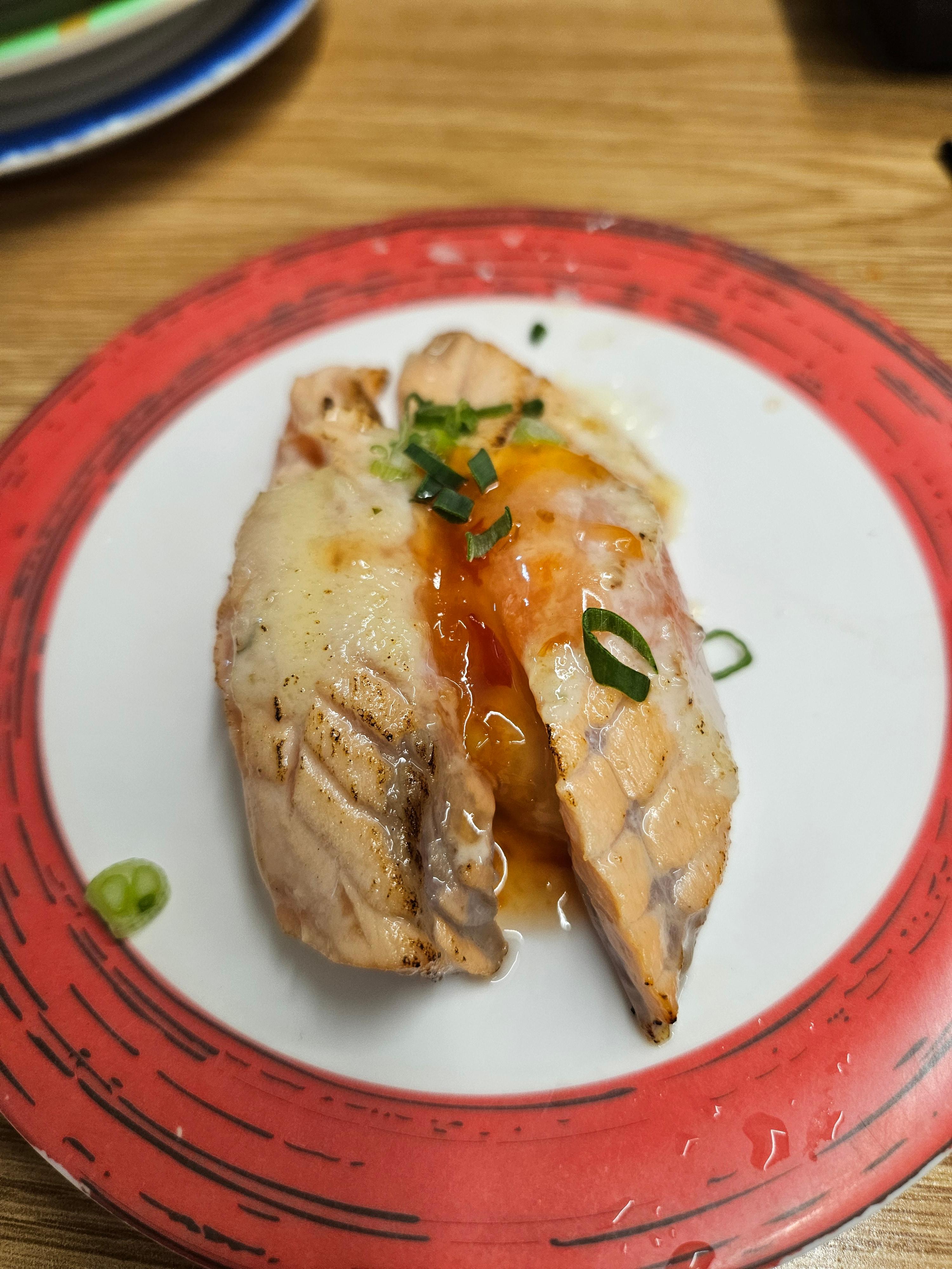 레일 위에 원하는 초밥이 없다고 실망하지 마세요. 자리마다 설치된 태블릿으로 먹고 싶은 초밥을 콕콕 찍어 주문하면 주방에서 바로 만들어 주십니다. 이번 방문에서 처음 도전해본 연어군함은 입안에서 사르르 녹는 맛이 일품이었어요.