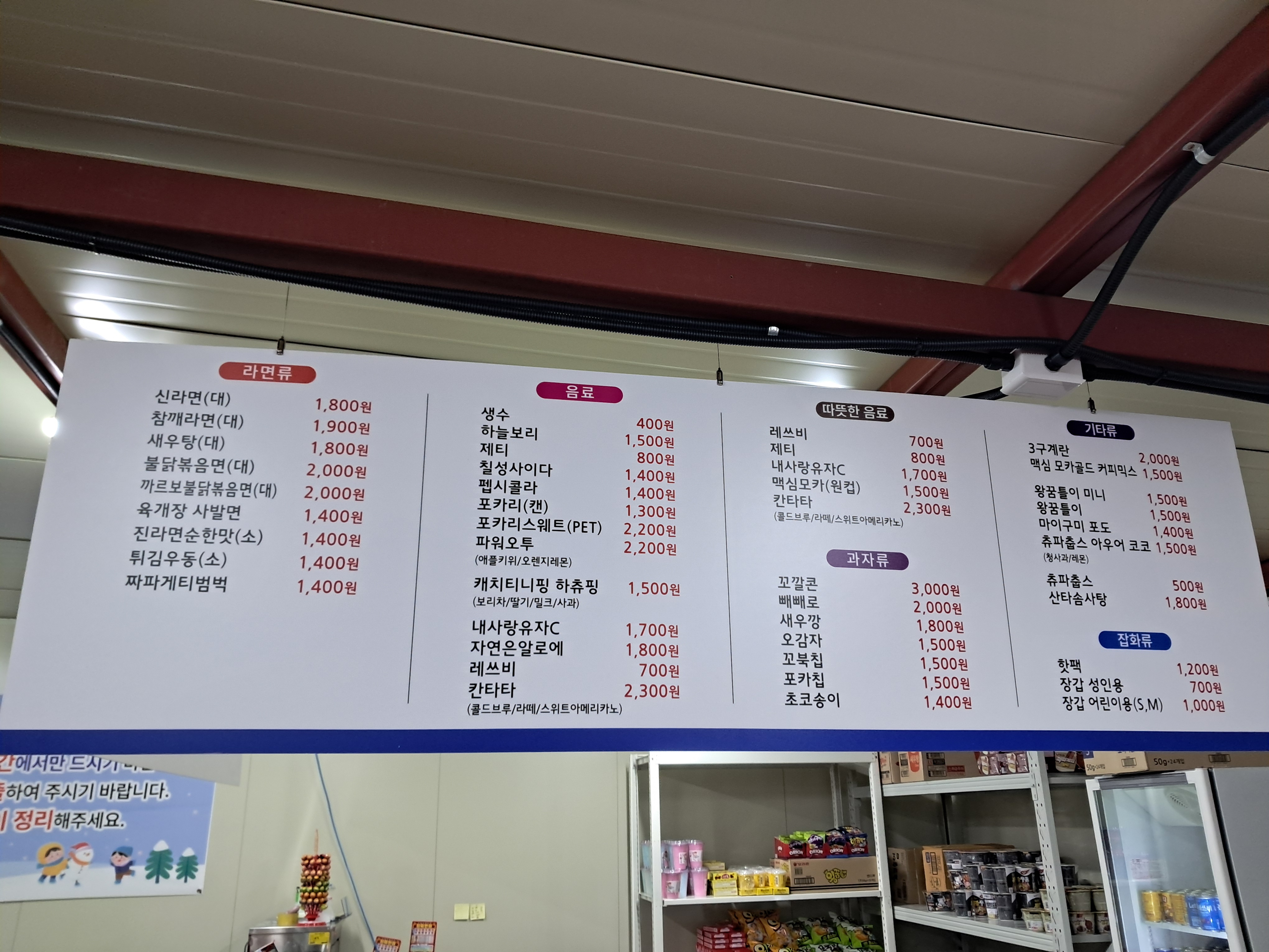그리고 야외 활동의 하이라이트! 바로 먹거리입니다. 열심히 달리고 난 뒤 정빙 시간(30분)이 찾아오면 매점과 푸드트럭으로 달려가야 합니다. 저희 아이들은 땀을 뻘뻘 흘린 뒤 컵라면을 먹었는데, "엄마, 꿀맛이야!"를 외치더군요. 차가운 겨울 공기 속에서 호호 불며 먹는 라면 맛, 이건 설명 안 해도 아시죠? 가격도 관광지 바가지요금 없이 착한 편이라 부담 없이 요기하기 좋았습니다.