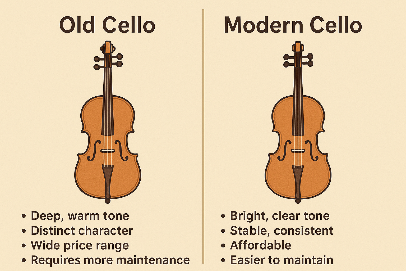학부(대학생) 이상이거나, 콩쿨 상위권을 노리는 고난도 단계라면 올드 첼로의 깊은 울림이 확실히 유리할 수 있다.