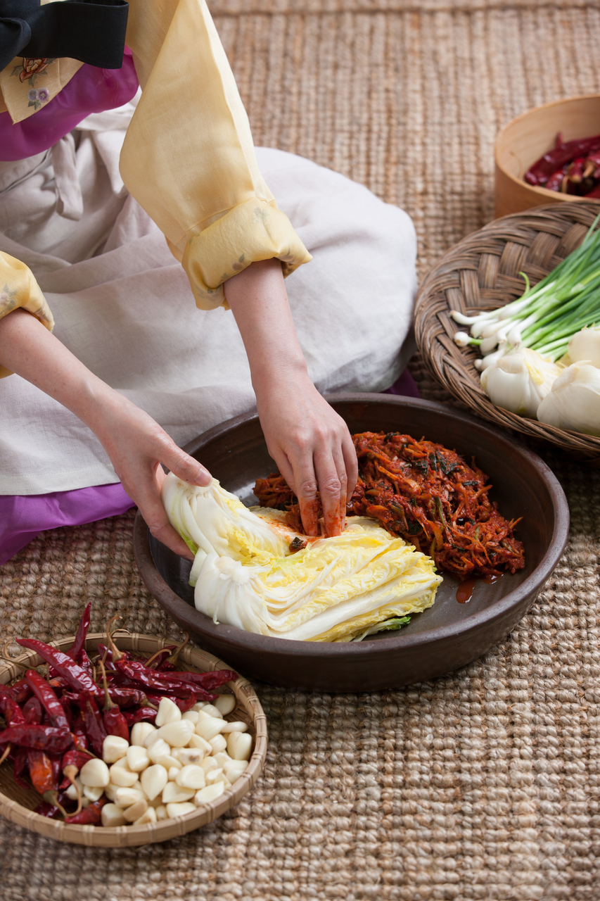 • 속을 넣은 후 배추를 반으로 접어 통에 차곡차곡 담습니다.